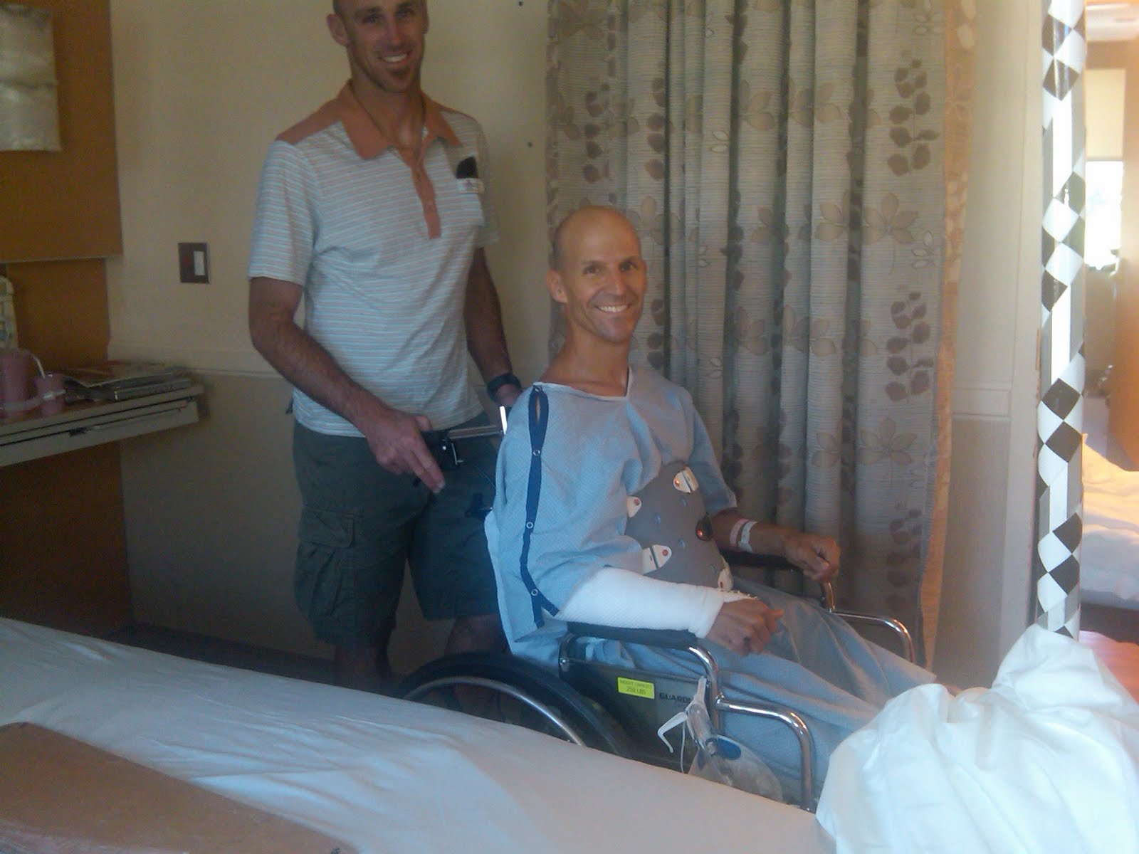 See the picture below of Jamie being pushed around the hospital by his buddy Kevin….Clearly, looking at Kevin’s shirt he has trouble with his Grandmother buying him clothes as well!